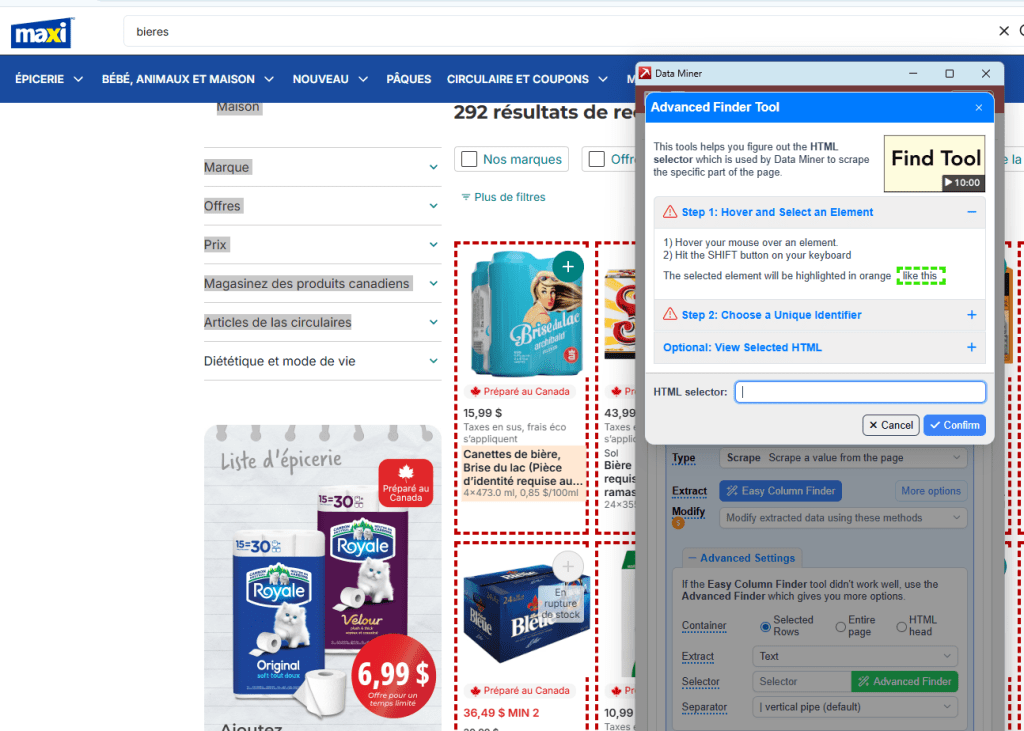 Data Miner a été configuré et installé. Ensuite, l’extraction des données a été effectuée à l’aide de cet outil sur les sites de chacune des épiceries mentionnées plus haut.