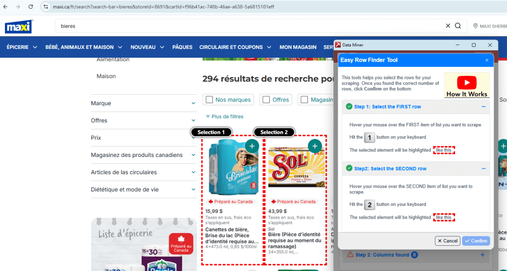 Les sites des épiceries IGA, Provigo et Maxi rendaient difficile la séparation des informations. Par exemple, avec Maxi, comme on peut le voir dans la première image, lorsque nous sélectionnions des cellules, il était impossible de confirmer le choix. De plus, toujours sur le site de Maxi, comme montré dans la deuxième image, même en utilisant l’outil de recherche avancée, il n’était pas possible d’accéder au prix des produits.